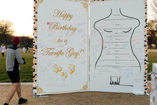 An oversize card reproduces a suggestive birthday greeting from 2003, released as part of a congressional inquiry. President Trump has denied that he signed it. Source: Original News