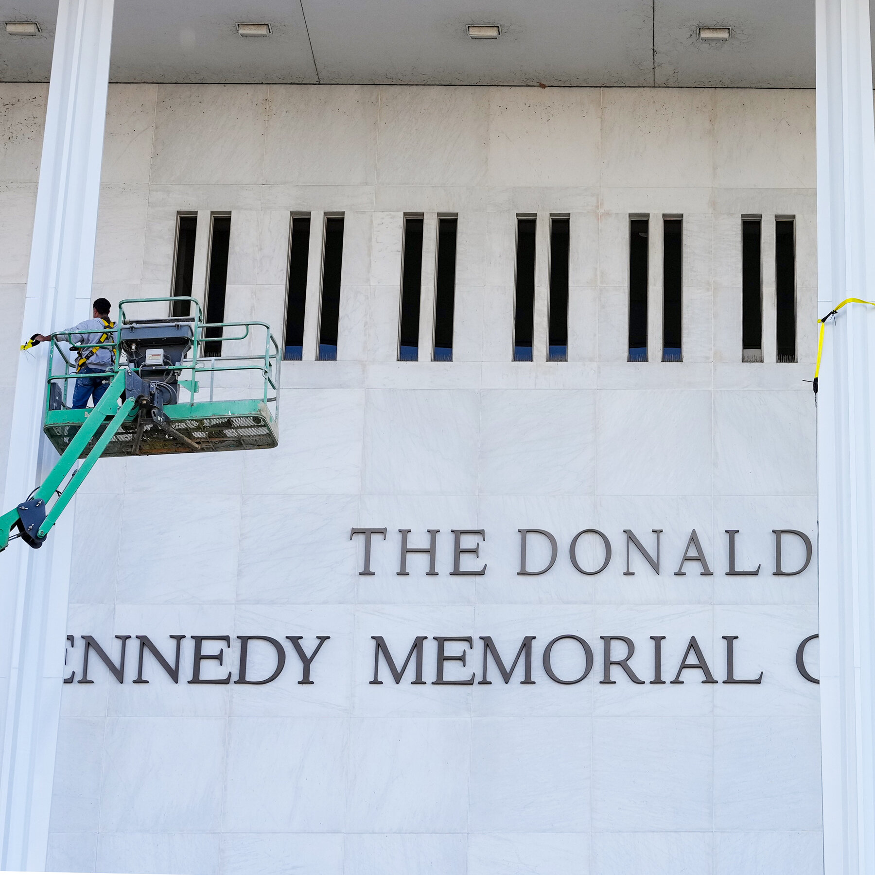 Workers hauled up large letters spelling out Mr. Trump’s full name to add to the white marble face of the building on Friday morning.